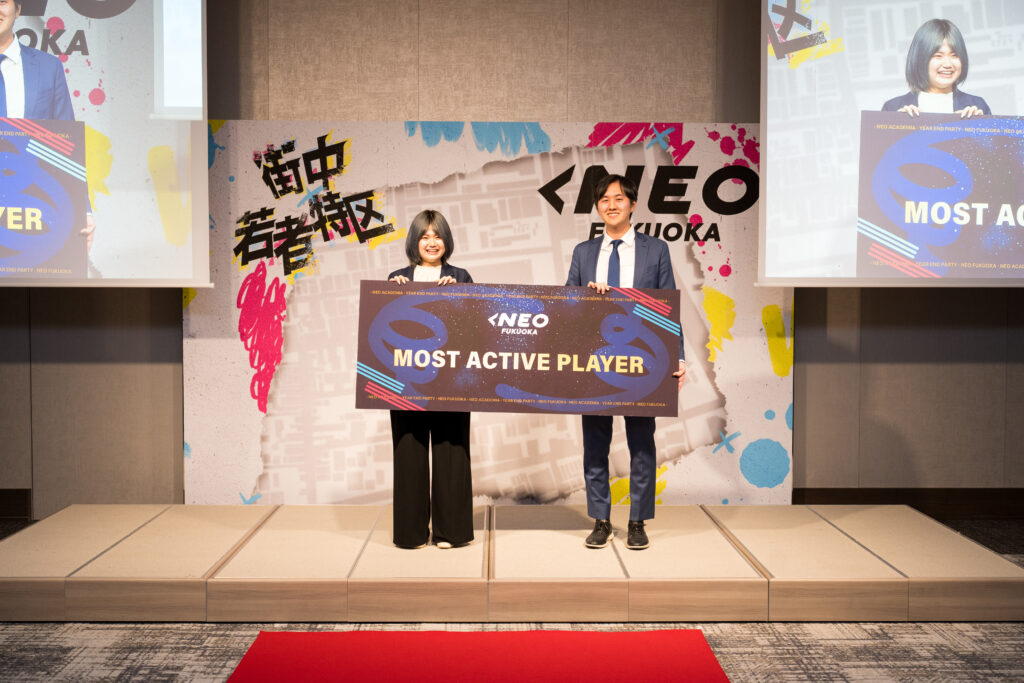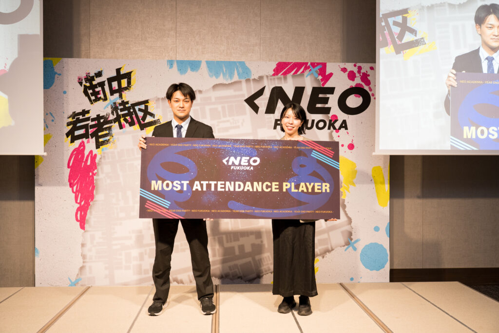 この賞はNEOACADEMIA講義や各種イベントへの積極的な参加、そして課題提出や取り組み姿勢を総合的に評価し、その継続力と姿勢が最も優れていた人に贈られました。出席率100%、課題提出率100%、応援カイギ参加率100%。全てにおいて100%を達成。毎月第2火曜日に開催している応援カイギでは、学生参加者と同じ目線で積極的に参加し、自ら学びを得ようとする主体的な姿勢が非常に印象的でした。常に当事者意識を持ち、学びと成長に向き合い続けた姿勢が称えられました。